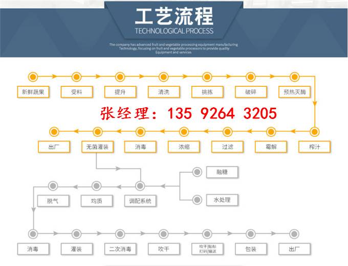 原料→毛刷清洗机→选果机→气泡清洗机→鼠笼式破碎机→强制喂料泵→螺旋榨汁机→旋振筛→暂存罐→螺杆泵→灭酶器→暂存罐→真空脱气机→螺杆泵→灭菌机→成品罐→至下道工序
