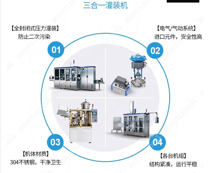 设备集冲洗.灌装.封盖于一体,适用于各种纯净水.矿泉水.果汁饮料.茶饮料的灌装生产。经过简单调整部分零部件,本机同时也可用于纯水,矿泉水的灌装生产。采用微重力负压灌装技术,灌装更迅速.稳定.准确,设备配有完善的回流系统,避免饮料的二次污染及氧化;能满足95℃以下的热灌装技术要求,并配备了CIP清洗系统,能对液缸,管道等液体接触的地方进行清洗;采用人机界面触摸屏控制,PLC电脑控制,变频器控制等先进技术。