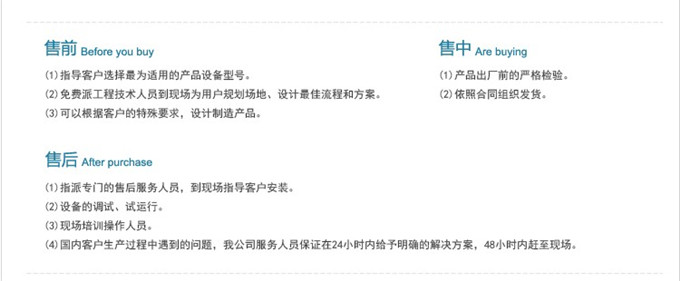 3.服务时间承诺:生产设备到达顾客厂房前请与售后服务部预约调试人员到达现场时间,根据要求会按期到达现场,设备运行中出现紧急情况不能处理时,直接反馈到售后服务部,工作时间外请于合同当事人或营销负责人取得联系,当接到通知后12小时到达现场。