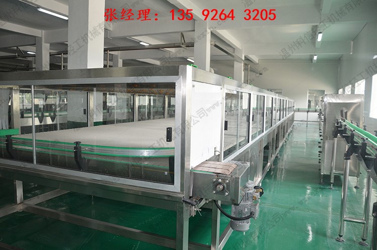 由输送带传送过来的包装瓶在设备入口处排瓶,顺序进入温区预升温85°C,然后进入第二温区灭菌温15分钟,第三和四、五温区逐渐降温,在出口部分设有净水喷淋,出口温度达到35℃。